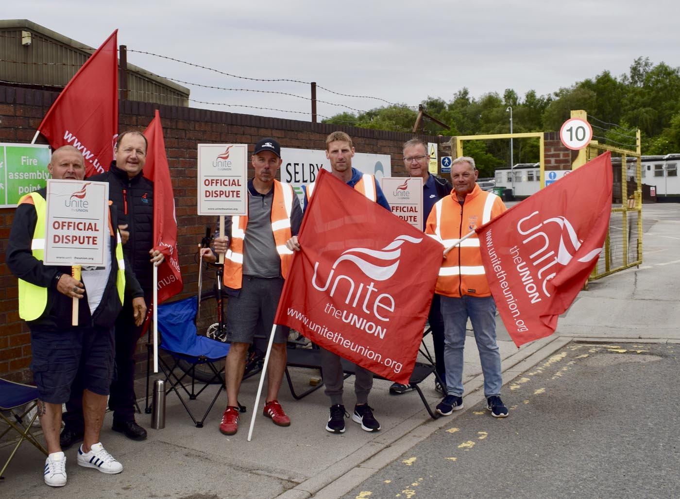 Pickets outside Selby’s Prospect Way depot. (29-06-114 ST CG)