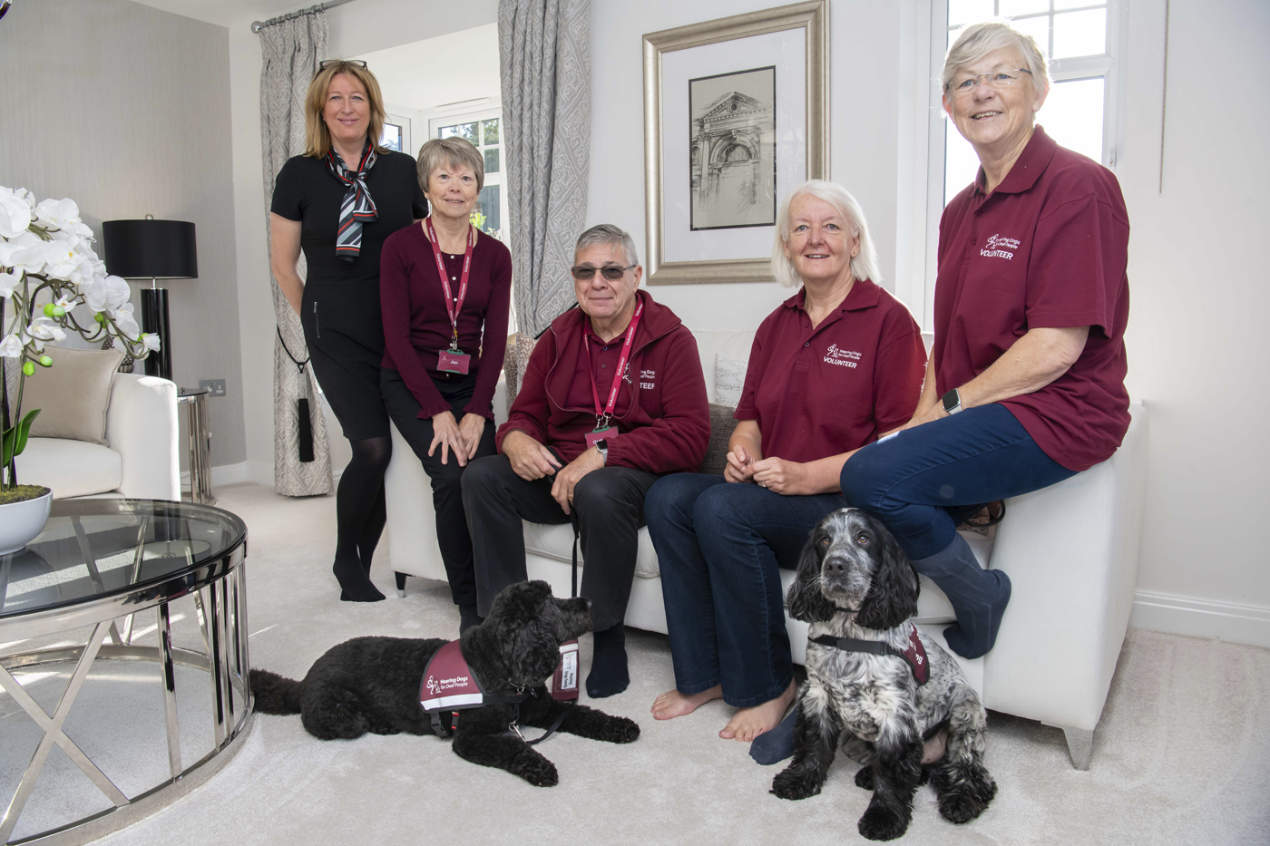 Pictured (L-R) Harron Homes sales executive Michelle Pawson, with Jan Shally, Grahame Shally, Diane Stephenson, Jacque Darlow, and hearing dogs Beck and Axel.