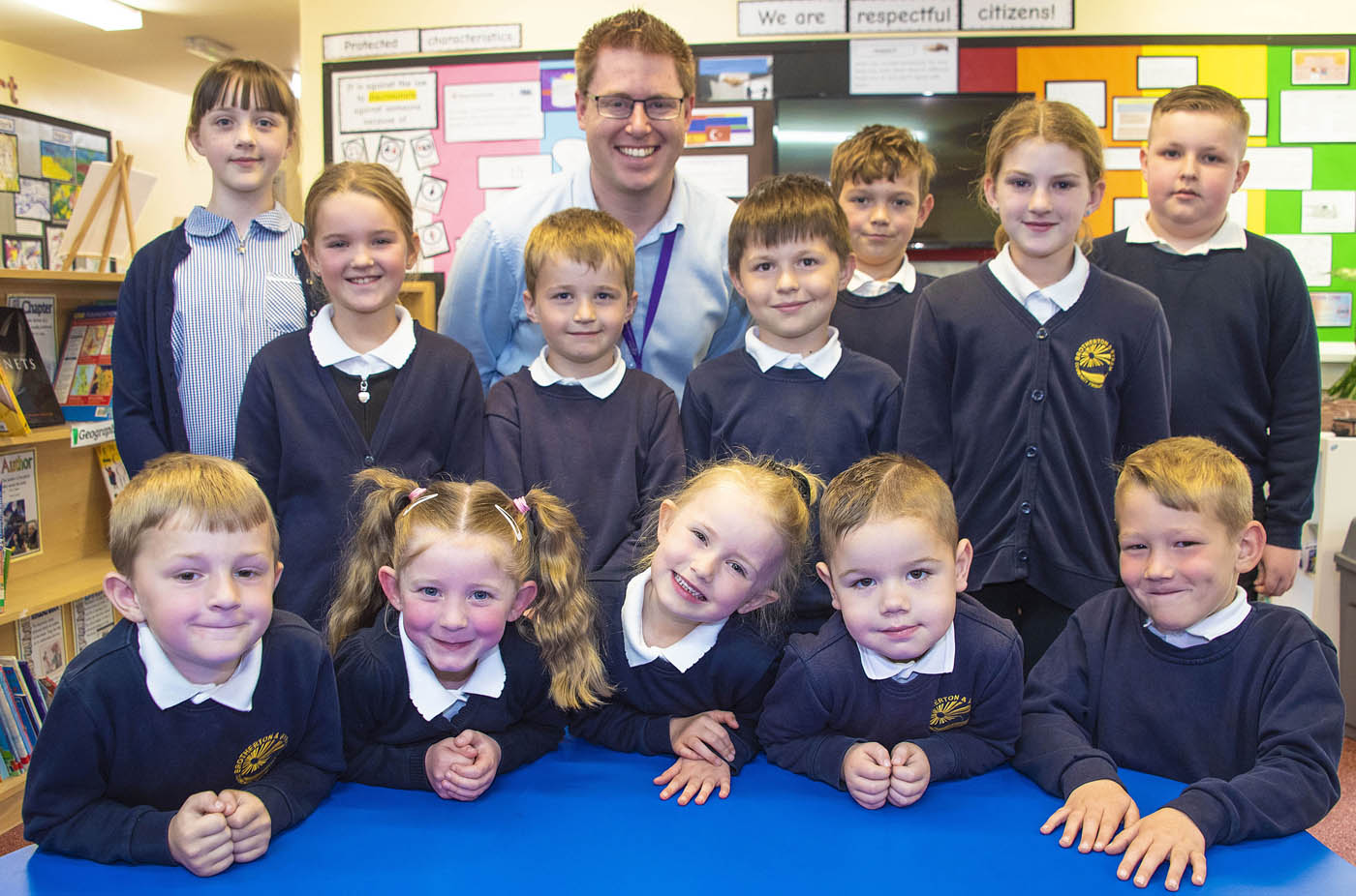Mr Greene with pupils from all year groups at the school. Photo by Tim Moat. (25-05-26 SU)